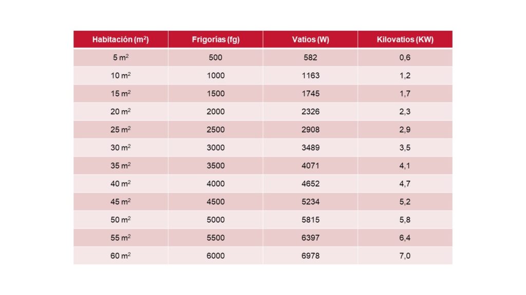 Tanto las frigorías como los vatios son unidades de medida utilizadas en los sistemas de climatización. Como medida general, se suele utilizar el cálculo de 100 frigorías por cada metro cuadrado de la habitación. Por ejemplo, una habitación de 27 m2 necesitaría un equipo de 2700 frigorías.